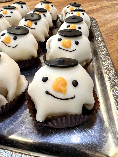 Sød snemand med flødeskum, lagkagebunde lagt sammen med orange Sarah Bernhardt. Overtrukket med marcipan.