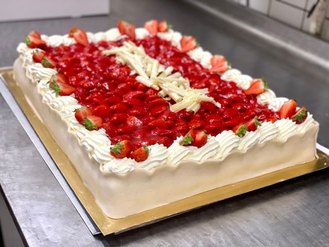 Jordbærlagkagen består af lyse lagkagebunde, vaniljefromage og jordbær. Marcipanbånd om kanten på kagen. Sprøjtes med et fint lag gelé og pyntes med flødeskum på toppen. Jordbærlagkagen laves i størrelser fra 15-50 personer.
